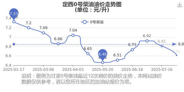 10月19日定西0号柴油的价格为6.61元每升,本次调整时间为10月14日,相对上次调整时间7月16日的油价6.67元每升,降了0.06元,降幅达0.9%。
