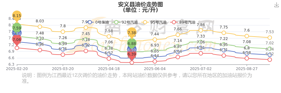 10月19日,安义县汽油、柴油每升的价格为10月14日调整后的价格,具体为:92号汽油为7.02元,降了0.06元,降幅达0.85%;95号汽油为7.53元,降了0.07元,降幅达0.92%;89号汽油为6.52元,降了0.06元,降幅达0.91%;0号柴油为6.74元,降了0.06元,降幅达0.88%。