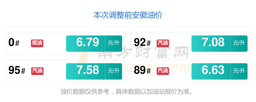 10月19日安徽汽油、柴油每升的价格为10月14日调整后的价格,92号汽油为7.02元,减了0.06元,减幅达0.85%;95号汽油为7.52元,减了0.06元,减幅达0.79%;89号汽油为6.57元,减了0.06元,减幅达0.91%;0号柴油为6.73元,减了0.06元,减幅达0.88%。
