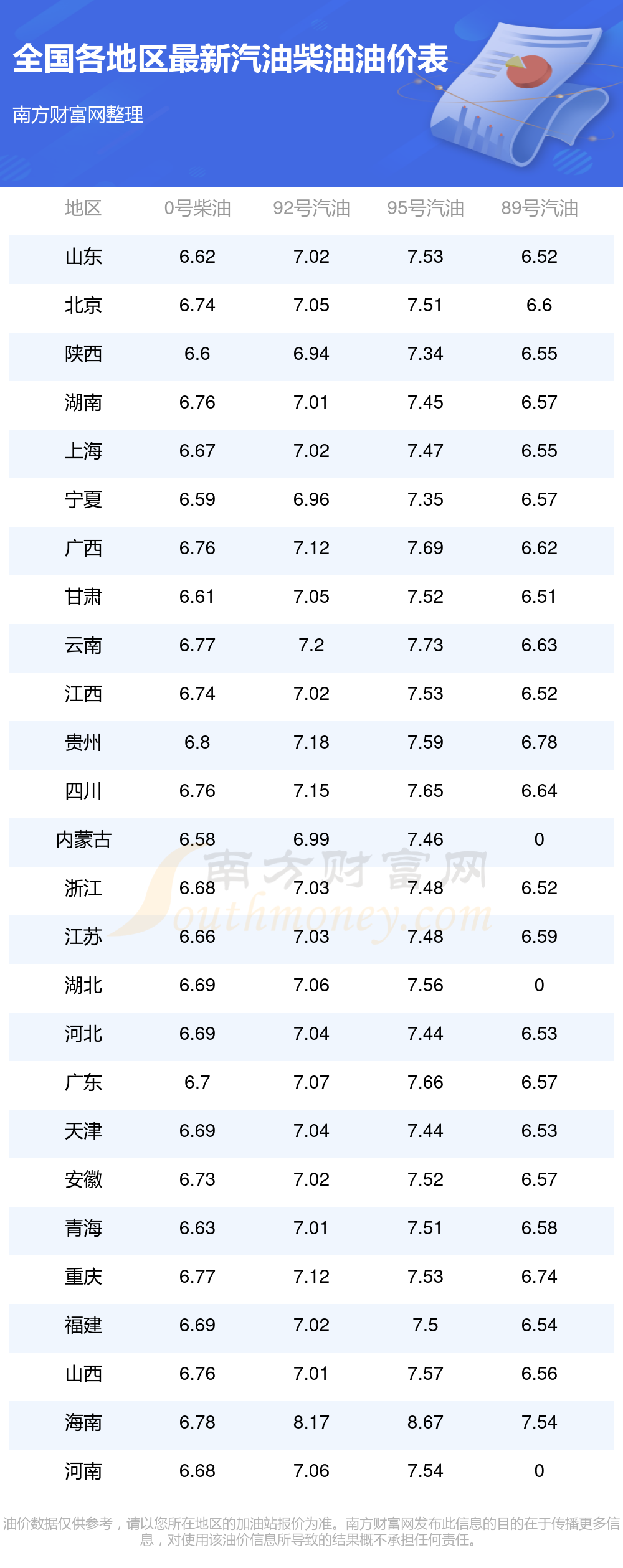 油价数据仅供参考,请以您所在地区的加油站报价为准。油价发布此信息的目的在于传播更多信息,对使用该油价信息所导致的结果概不承担任何责任。