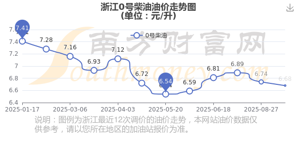 10月20日,浙江0号柴油的价格是6.68元每升,本次的调整时间为10月14日,对比上次的调整下调了0.06元,下调0.89%,下次调整时间为10月27日24时,还有7.95天。