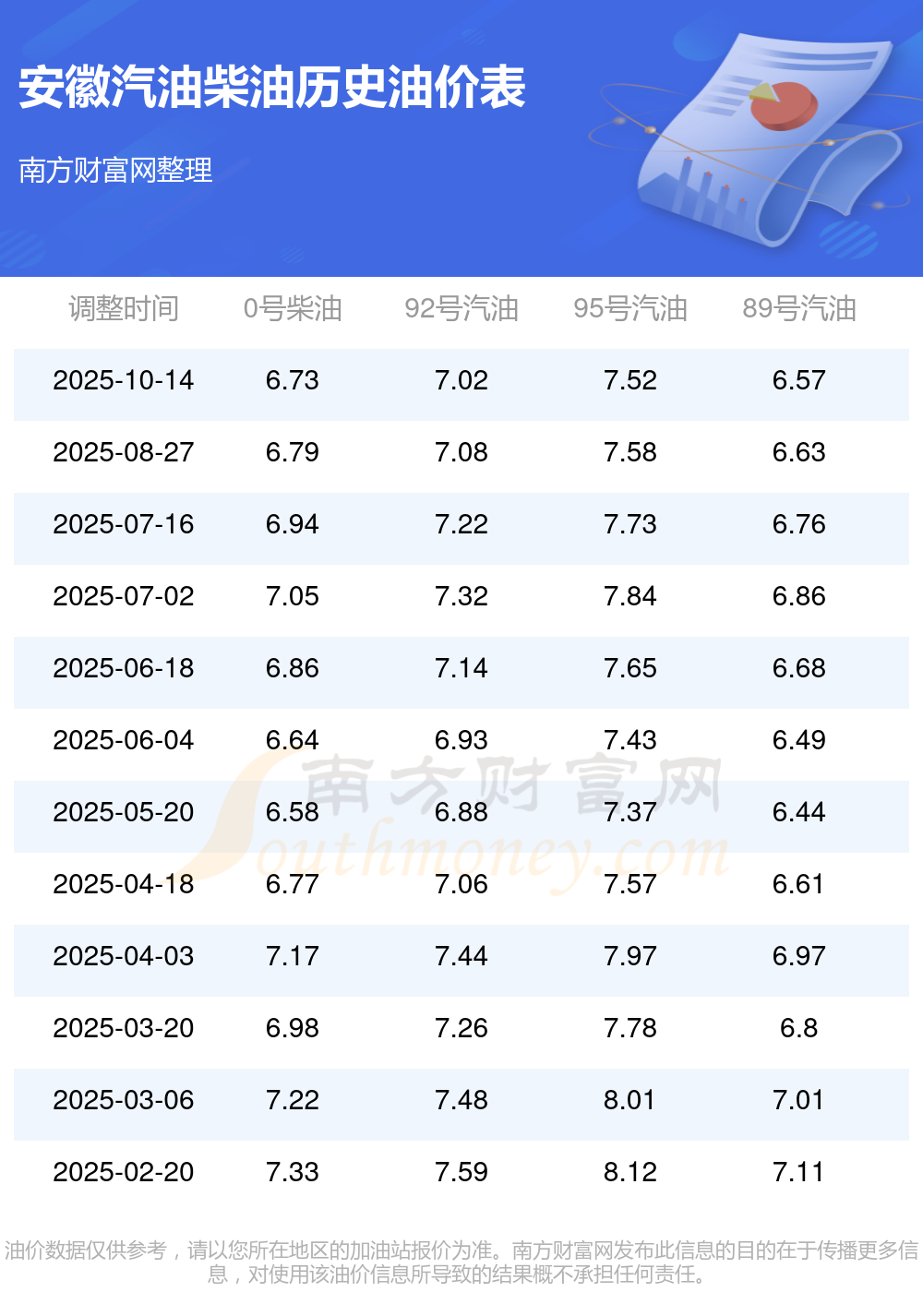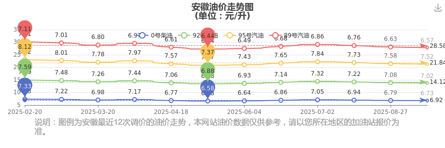 安徽汽油、柴油10月20日每升最新价格为:调整时间为10月14日,92号汽油为7.02元,下降了0.06元;95号汽油为7.52元,下降了0.06元;89号汽油为6.57元,下降了0.06;0号柴油为6.73元,下降了0.06元。