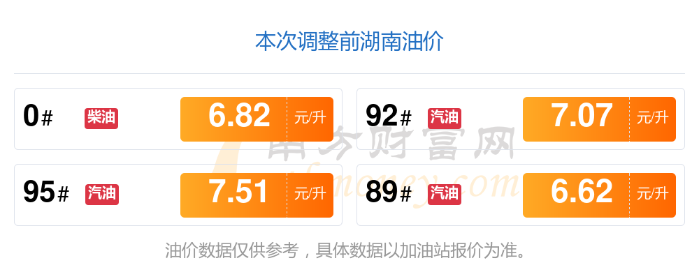 10月20日,湖南95号汽油的价格是7.45元每升,本次的调整时间为10月14日,对比上次的调整跌了0.06元,跌0.844%,10月27日24时为下一轮油价调整时间,还有7.95天。