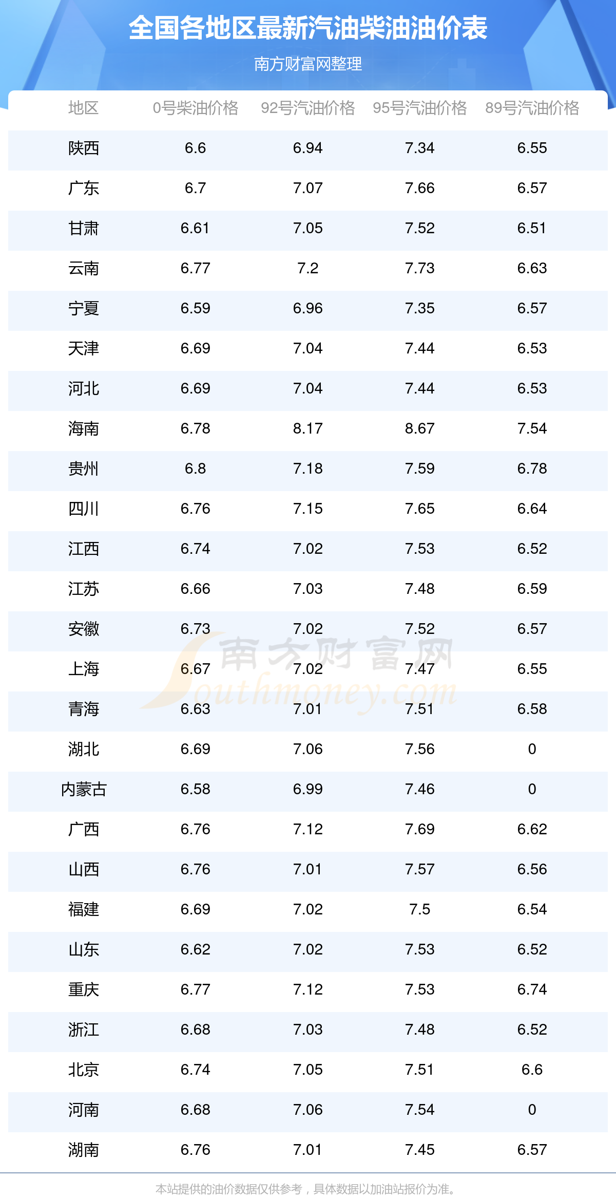 油价数据仅供参考,请以您所在地区的加油站报价为准。油价发布此信息的目的在于传播更多信息,对使用该油价信息所导致的结果概不承担任何责任。