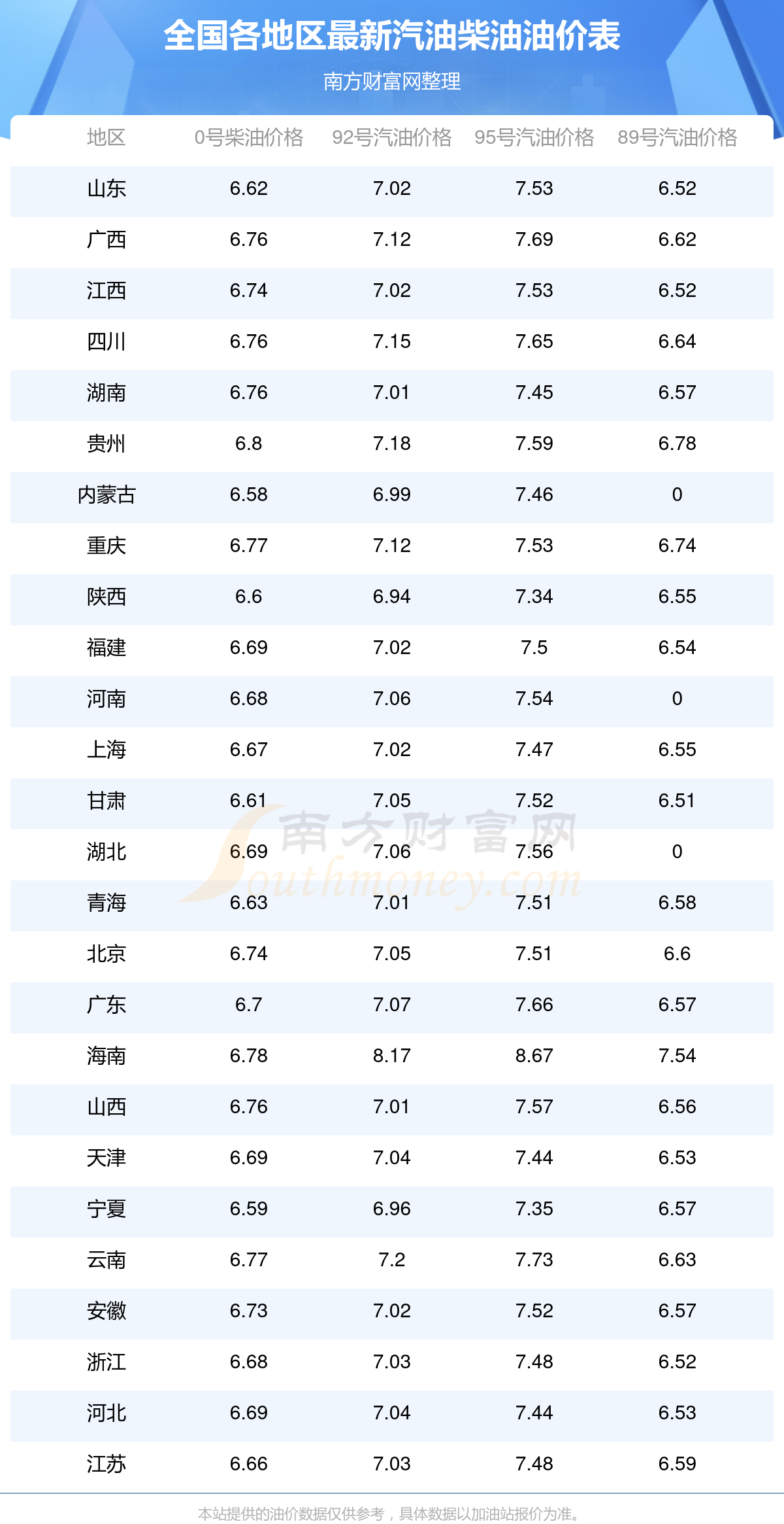 国内今日油价0号柴油-10月20日0号柴油价格查询、多少钱一升 油价网2025-10-20 07:05 今日10月20日油价查询_湖南今日油价95、92号汽油价格_柴油价格 油价网2025-10-20 07:03 今日北京油价查询 _ 10月20日92号_95号汽油价格今日多少钱 油价网2025-10-20 06:44 天津89号汽油今日油价_89号汽油多少钱一升(10月20日) 油价网2025-10-20 06:38