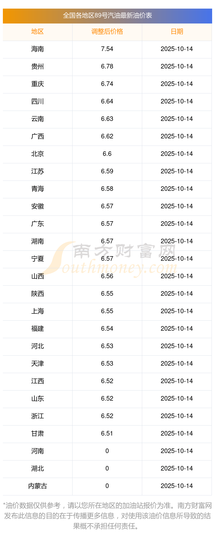 10月20日全国89号汽油价格多少钱一升?10月14日油价调整后,具体为:平均价格为7元/升,最低的是甘肃,价格6.51元/升,最高的是海南,价格7.54元/升。
