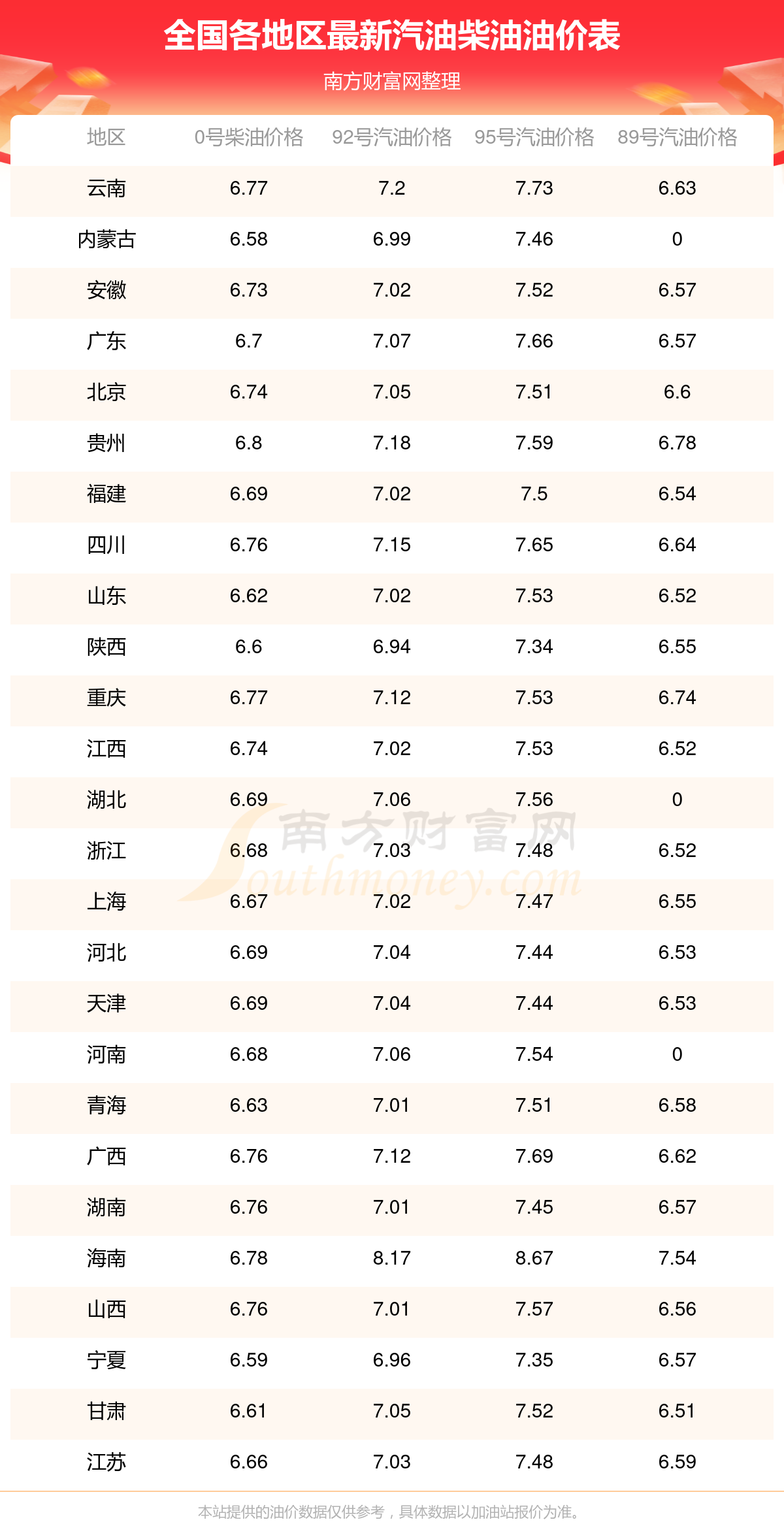本站提供的油价数据仅供参考,具体数据以加油站报价为准。