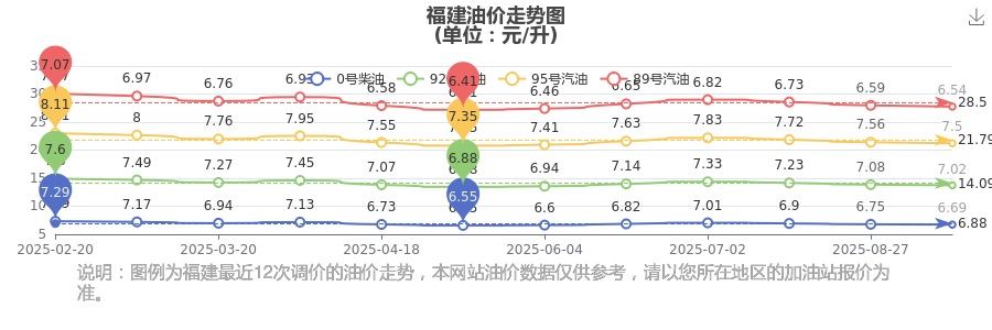 福建汽油、柴油10月20日每升最新价格为:92号汽油为7.02元;95号汽油为7.5元;89号汽油为6.54元,下降了0.05;0号柴油为6.69元,调整时间为10月14日。