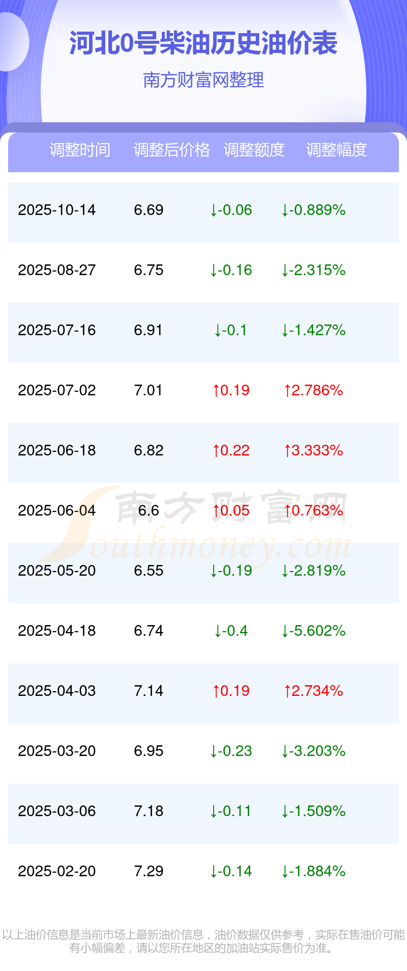 10月20日,河北0号柴油的最新价格为6.69元/升,本轮油价调整时间是10月14日,对比上次调整共跌了0.06元,跌0.889%。