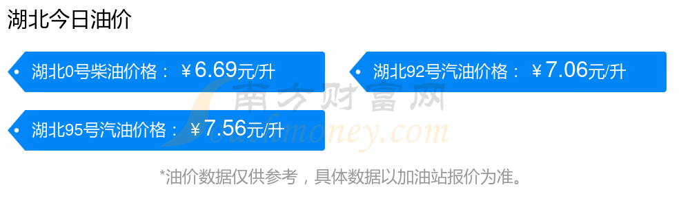 10月20日湖北汽油、柴油每升最新价格多少钱一升?具体为:92号汽油7.06元,下降了0.06元;95号汽油7.56元,下降了0.06元;0号柴油为6.69元,下降了0.06元,本次的调整时间是10月14日。