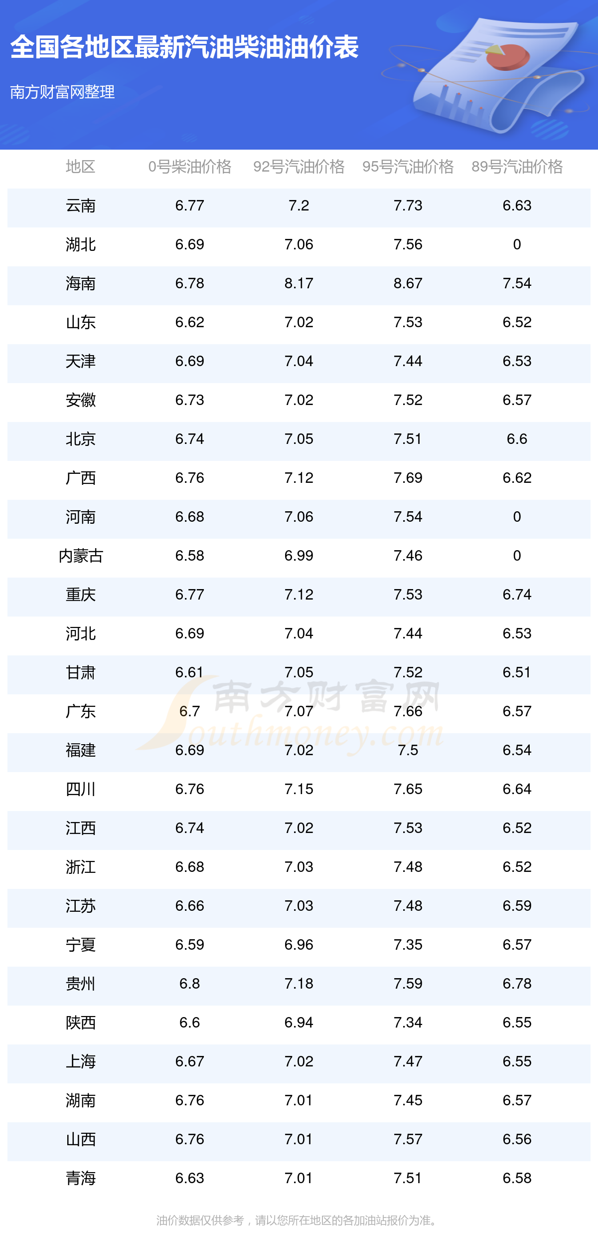 油价数据仅供参考,请以您所在地区的各加油站报价为准。
