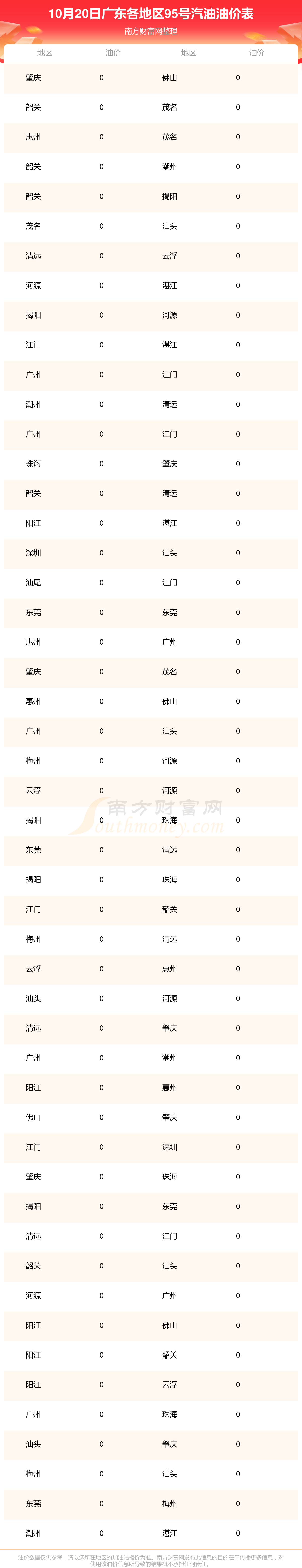 广东各地区最新95号汽油油价表