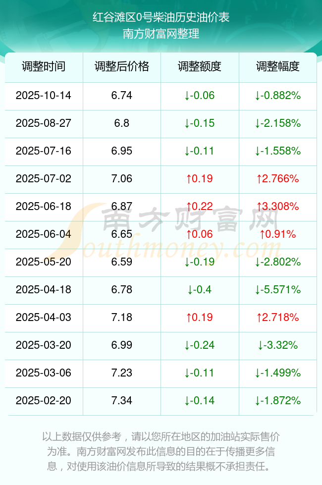 10月20日红谷滩区0号柴油的价格为6.74元/升,本轮油价的调整时间为10月14日,相对上一轮油价调整时间8月27日的价格6.8元/升,减了0.06元,减幅达0.882%。