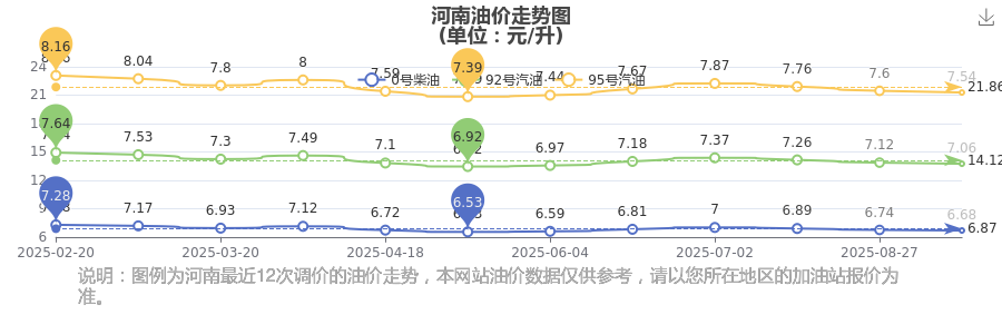 10月20日,河南汽油、柴油每升的价格为:92号汽油7.06元,下降了0.06元;95号汽油7.54元,下降了0.06元;0号柴油为6.68元,下降了0.06元,本轮调整时间是10月14日。
