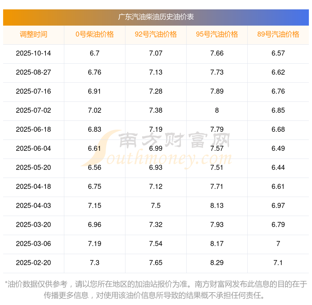 广东89号汽油10月20日的价格为6.57元每升,调整时间为10月14日,对比上次调整时间8月27日的油价6.62元每升,减了0.05元。