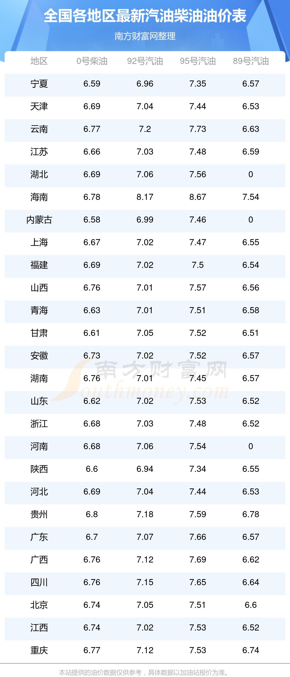 以上油价信息是当前市场上最新油价信息,油价数据仅供参考,实际在售油价可能有小幅偏差,请以您所在地区的加油站实际售价为准。