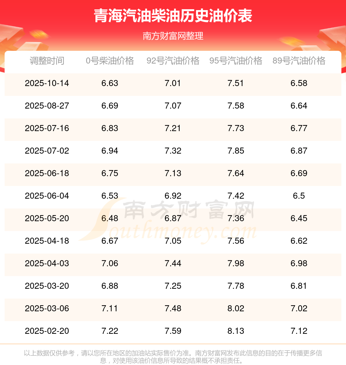 10月20日青海汽油、柴油油价:本轮油价调整时间是10月14日,92号汽油7.01元,下调了0.06元,下调幅达0.85%;95号汽油7.51元,下调了0.07元,下调幅达0.92%;89号汽油6.58元,下调了0.06元,下调幅达0.9%;0号柴油6.63元,下调了0.06元,下调幅达0.9%。