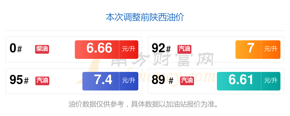 10月20日陕西汽油、柴油最新价格:本次油价调整时间是10月14日,92号汽油6.94元,降了0.06元,降幅达0.86%;95号汽油7.34元,降了0.06元,降幅达0.81%;89号汽油6.55元,降了0.06元,降幅达0.91%;0号柴油6.6元,降了0.06元,降幅达0.9%。