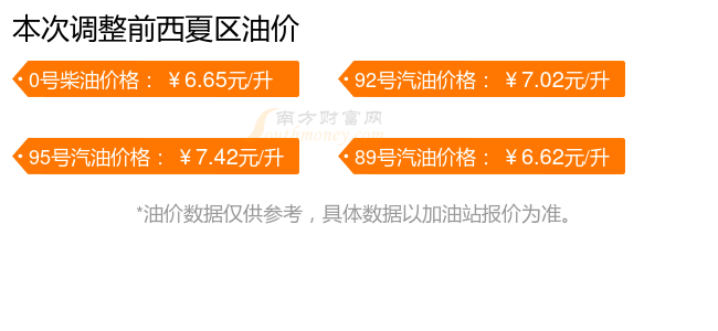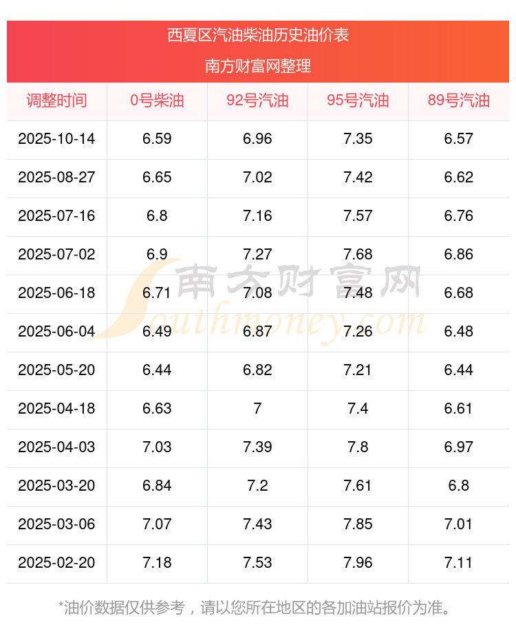10月20日,西夏区汽油、柴油每升最新价格:调整时间为10月14日,92号汽油为6.96元,下降了0.06元,下降幅达0.86%;95号汽油为7.35元,下降了0.07元,下降幅达0.94%;89号汽油为6.57元,下降了0.05元,下降幅达0.76%;0号柴油为6.59元,下降了0.06元,下降幅达0.9%。
