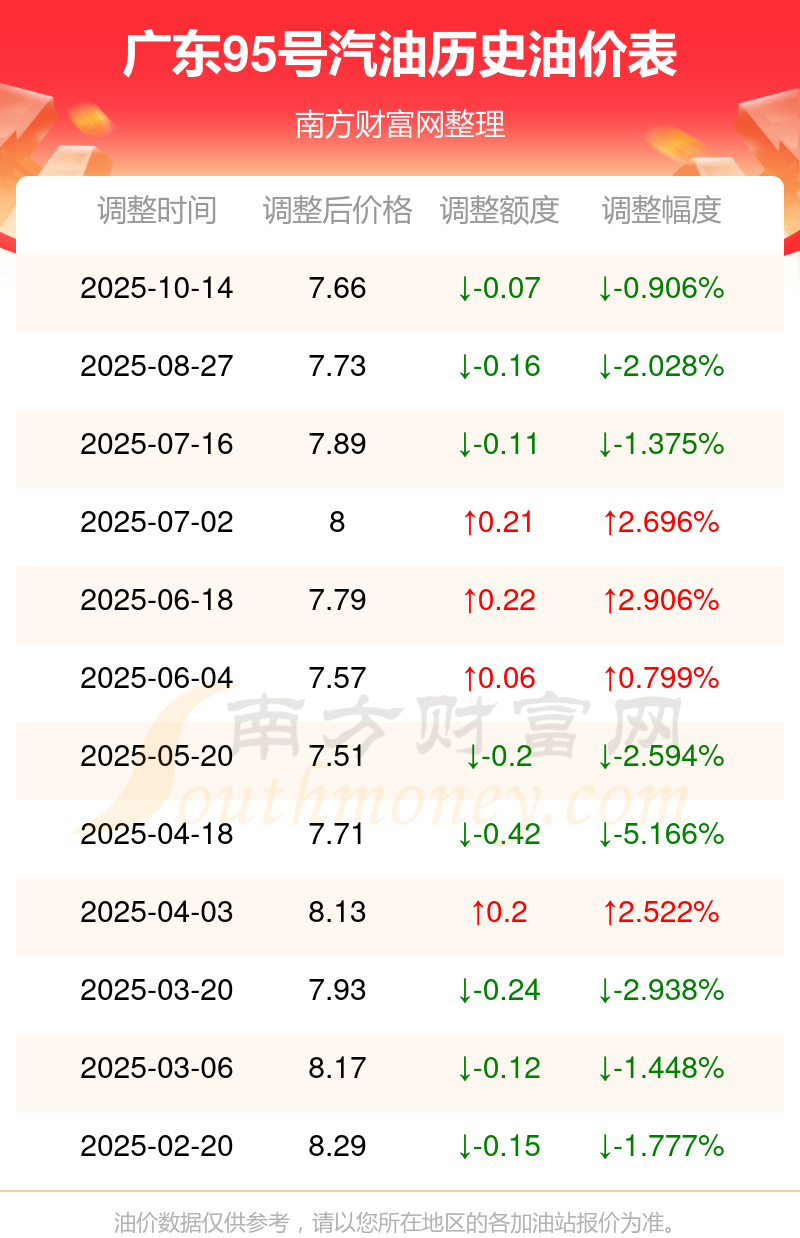 广东95号汽油10月20日的油价为10月14日调整后的价格,具体是7.66元/升,对比上次油价调整下跌了0.07元,下跌0.906%。