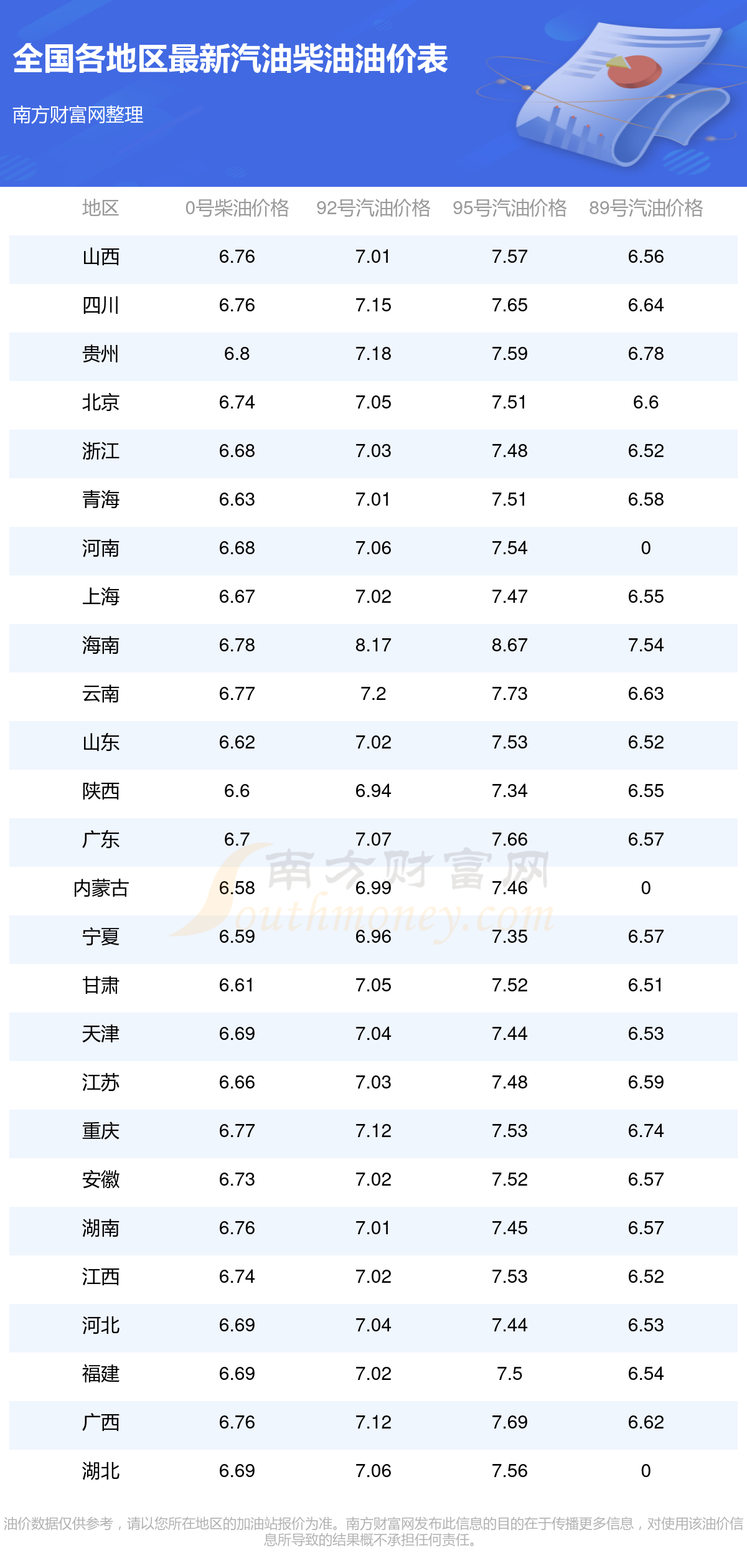 油价数据仅供参考,请以您所在地区的加油站报价为准。油价发布此信息的目的在于传播更多信息,对使用该油价信息所导致的结果概不承担任何责任。
