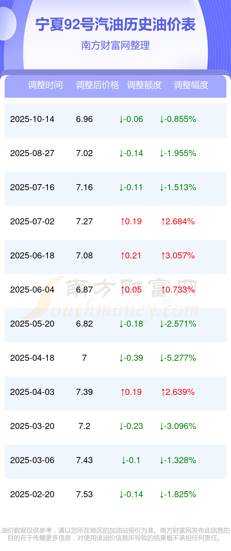 宁夏92号汽油10月20日的价格是6.96元每升,这是10月14日调整后的价格,相对比上次调整时间8月27日的油价7.02元每升,下降了0.06元。