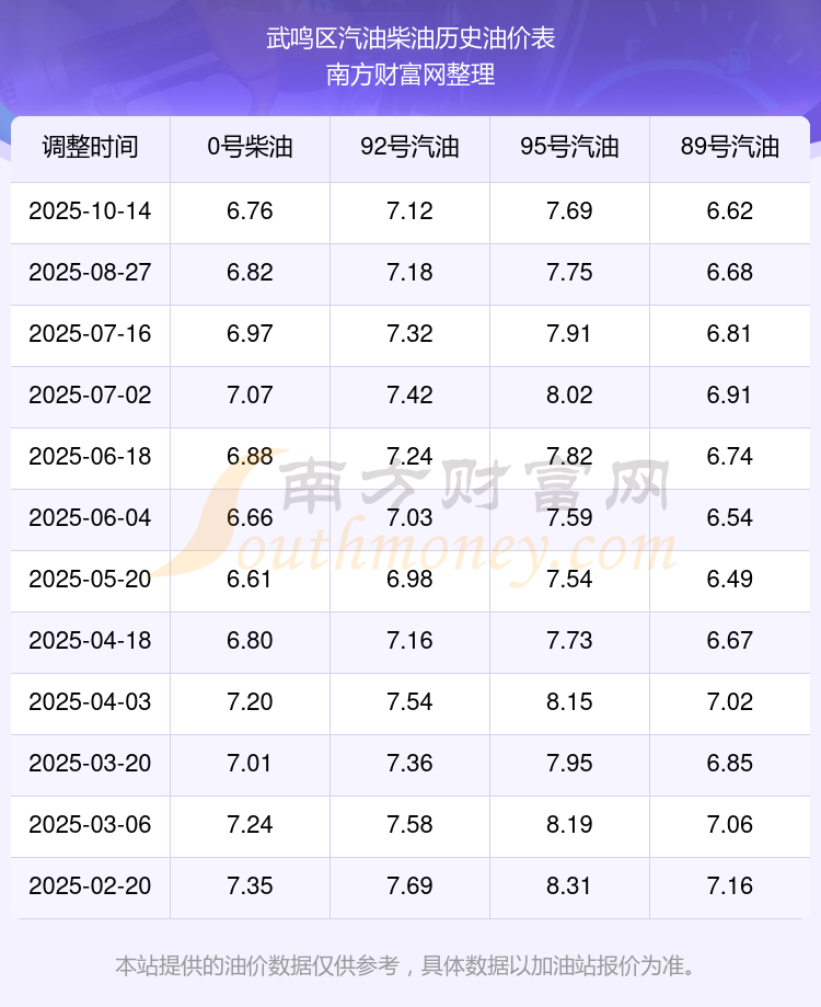 武鸣区汽油、柴油10月20日价格多少钱一升?具体为:0号柴油为6.76元,下跌了0.06元;95号汽油为7.69元;92号汽油为7.12元;89号汽油为6.62元,调整时间为10月14日。