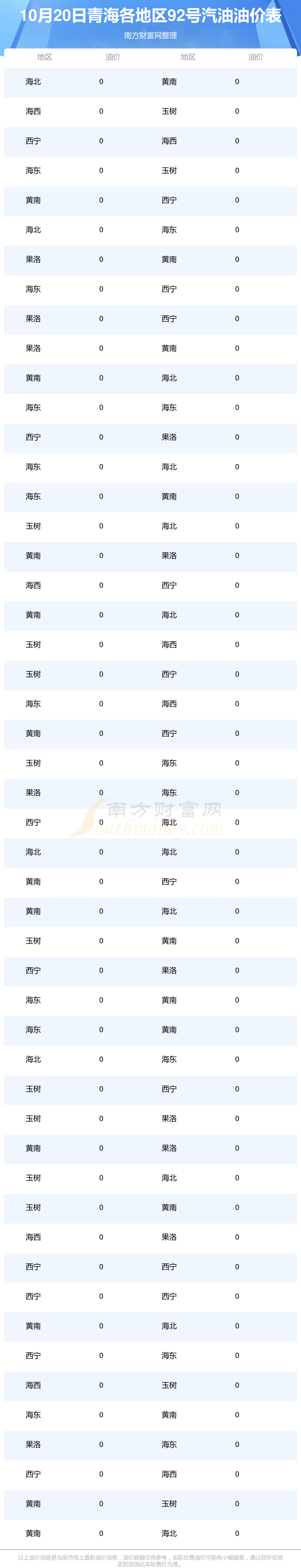 10月20日青海92号汽油价格是10月14日调整后的价格,具体价格是7.01元每升,相对上轮调整时间8月27日的油价7.07元/升,共降了0.06元。