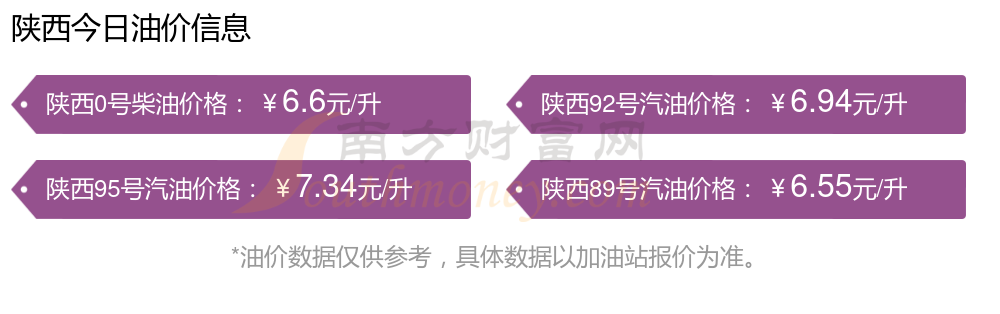 10月21日,陕西汽油、柴油每升的价格为:92号汽油6.94元,降了0.06元;95号汽油7.34元,降了0.06元;89号汽油6.55元,降了0.06;0号柴油为6.6元,降了0.06元,本轮调整时间是10月14日。