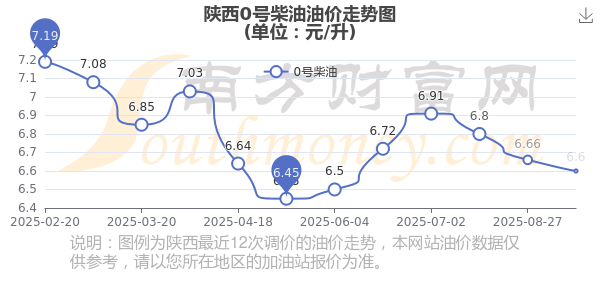 10月21日,陕西0号柴油的价格是6.6元每升,本次的调整时间为10月14日,对比上次的调整下跌了0.06元,下跌0.901%,下次调整时间为10月27日24时,还有6.92天。