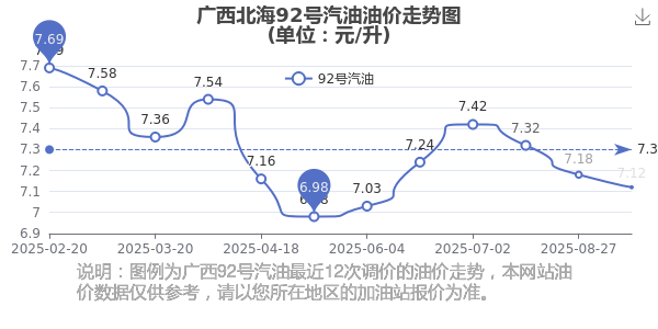 广西北海92号汽油10月21日价格查询:10月14日油价调整后,广西北海92号汽油7.12元/升,相对上次调整时间8月27日的油价7.18元每升,下降了0.06元,下降0.836%。