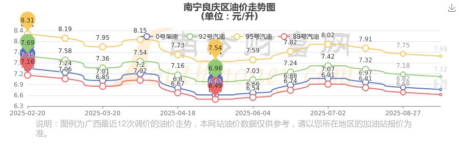 南宁良庆区汽油、柴油10月21日每升的价格是多少?10月14日调整后的价格详情如下:92号汽油7.12元;95号汽油7.69元;89号汽油6.62元;0号柴油6.76元。
