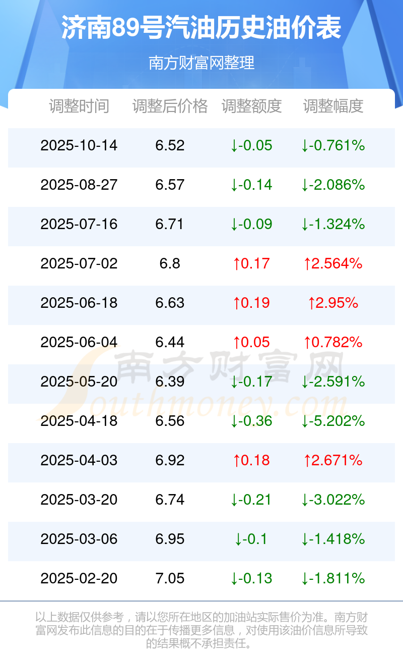 济南89号汽油10月21日的价格为10月14日调整后的价格,具体为6.52元/升,相对上次调整减了0.05元。
