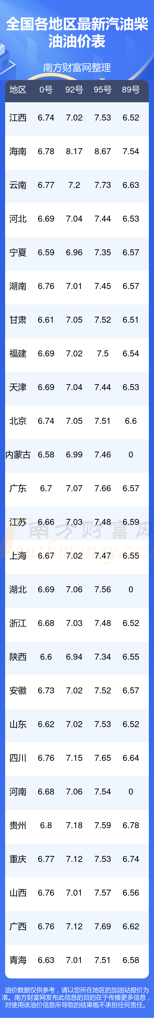 以上数据仅供参考,请以您所在地区的加油站实际售价为准。油价发布此信息的目的在于传播更多信息,对使用该油价信息所导致的结果概不承担责任。
