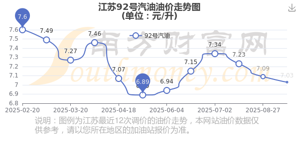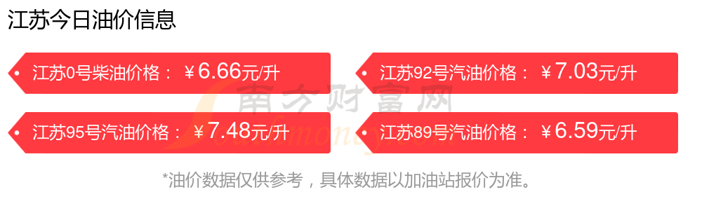 10月22日江苏汽油、柴油每升的最新价格:92号汽油7.03元,跌了0.06元;95号汽油7.48元,跌了0.06元;89号汽油6.59元,跌了0.05;0号柴油为6.66元,跌了0.06元,本次油价调整时间是10月14日。
