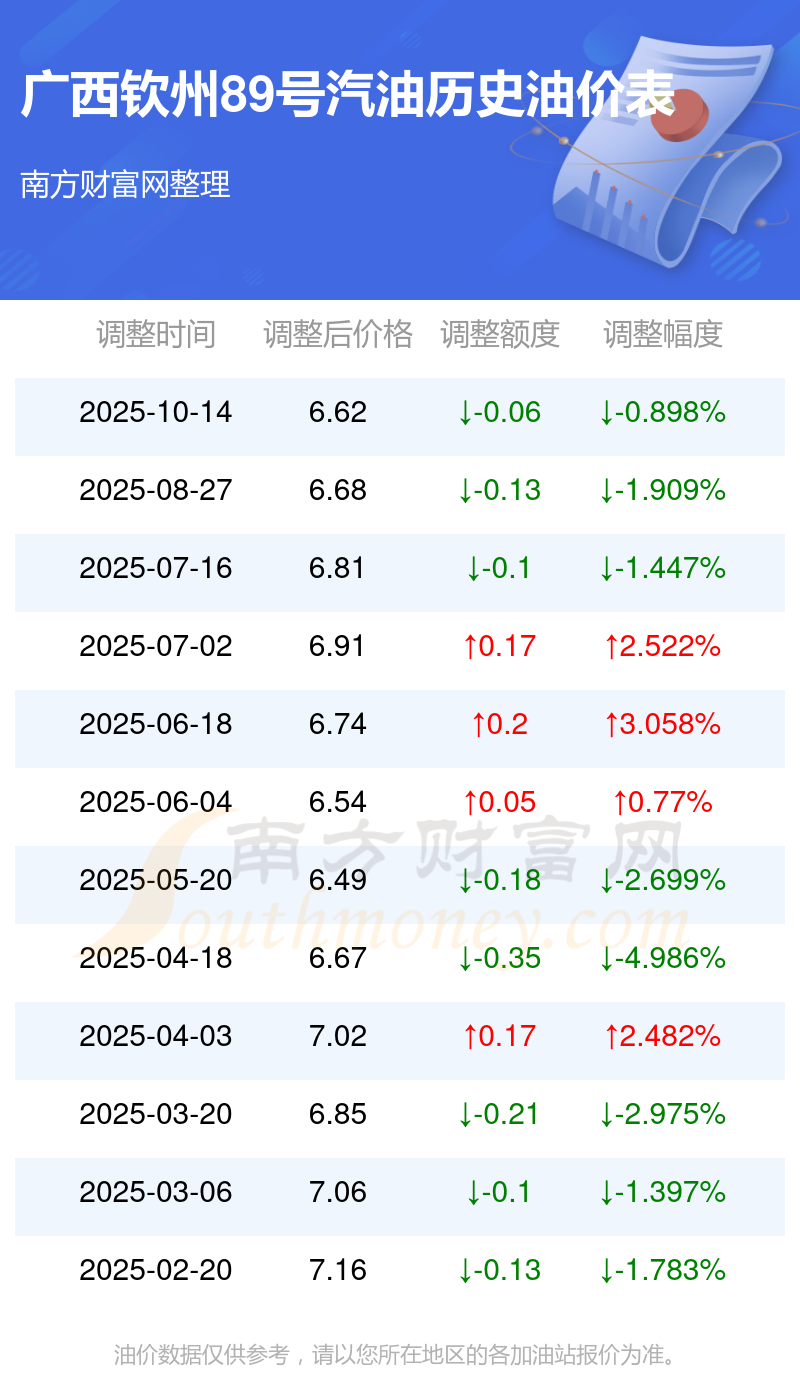 10月22日,广西钦州89号汽油价格为每升6.62元,这是10月14日油价调整后的价格,相对上次调整时间8月27日的油价6.68元每升,下调了0.06元,下调0.898%。