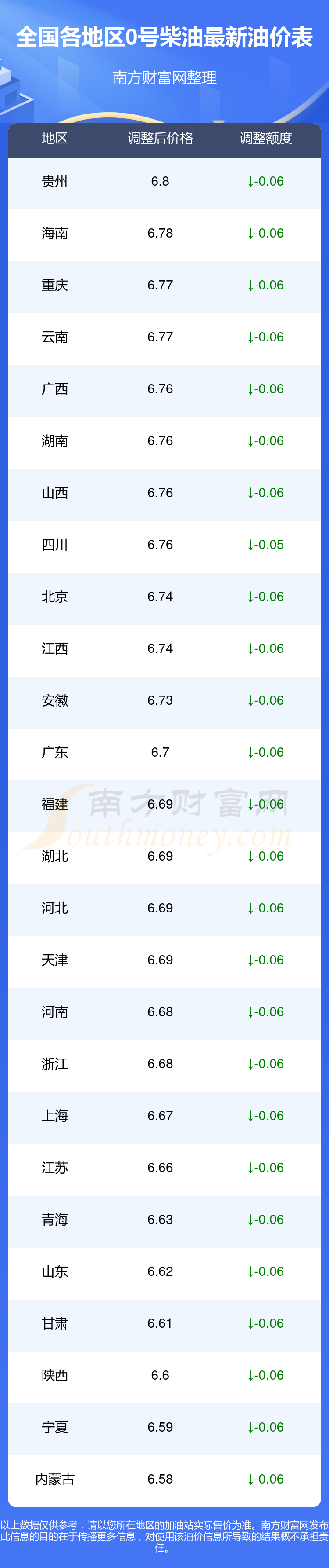 10月22日全国0号柴油价格具体为(调整时间为10月14日):平均价格7元/升,其中全国0号柴油最低为内蒙古,价格为6.58元/升,0号柴油最高为贵州,价格为6.80元/升。
