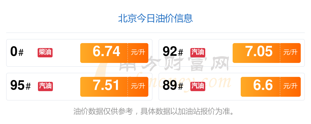 10月22日,北京汽油、柴油每升的价格为:92号汽油7.05元,减了0.06元;95号汽油7.51元,减了0.06元;89号汽油6.6元,减了0.06;0号柴油为6.74元,减了0.06元,本轮调整时间是10月14日。
