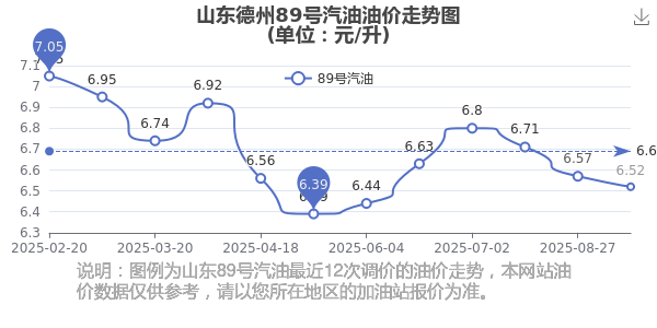 山东德州89号汽油10月22日的最新价格(10月14日油价调整后的价格):山东德州89号汽油6.52元/升,相对上次调整时间8月27日的油价6.57元每升,降了0.05元,降0.761%。