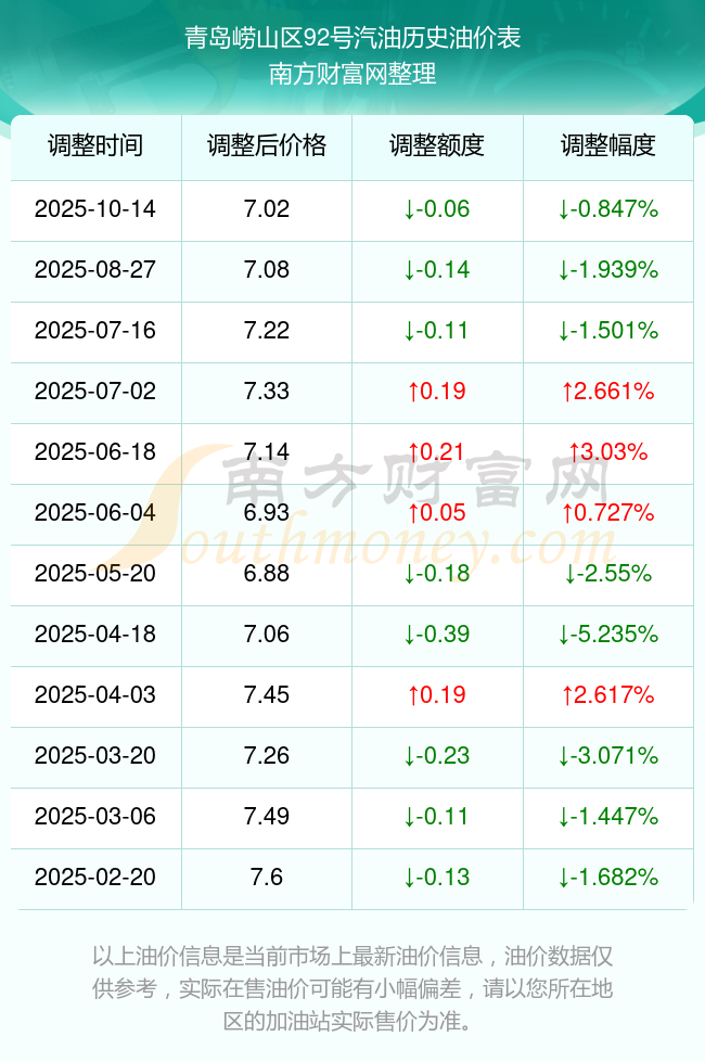 10月22日青岛崂山区92号汽油的价格是10月14日调整后的价格,具体为7.02元/升,对比上次调整时间8月27日的油价7.08元每升,下跌了0.06元,下跌幅达0.847%。