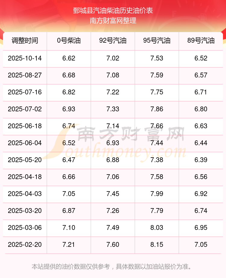 10月22日鄄城县汽油、柴油每升的价格是多少?详情如下:95号汽油为7.53元,下跌了0.06元;92号汽油为7.02元,下跌了0.06元;89号汽油为6.52元,下跌了0.05元;0号柴油为6.62元,下跌了0.06元,调整时间为10月14日。