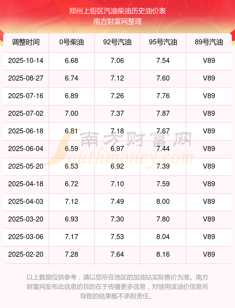 10月22日,郑州上街区汽油、柴油每升的价格是多少?10月14日油价调整后,92号汽油为7.06元,减了0.06元,减幅达0.84%;95号汽油为7.54元,减了0.06元,减幅达0.79%;0号柴油为6.68元,减了0.06元,减幅达0.89%。
