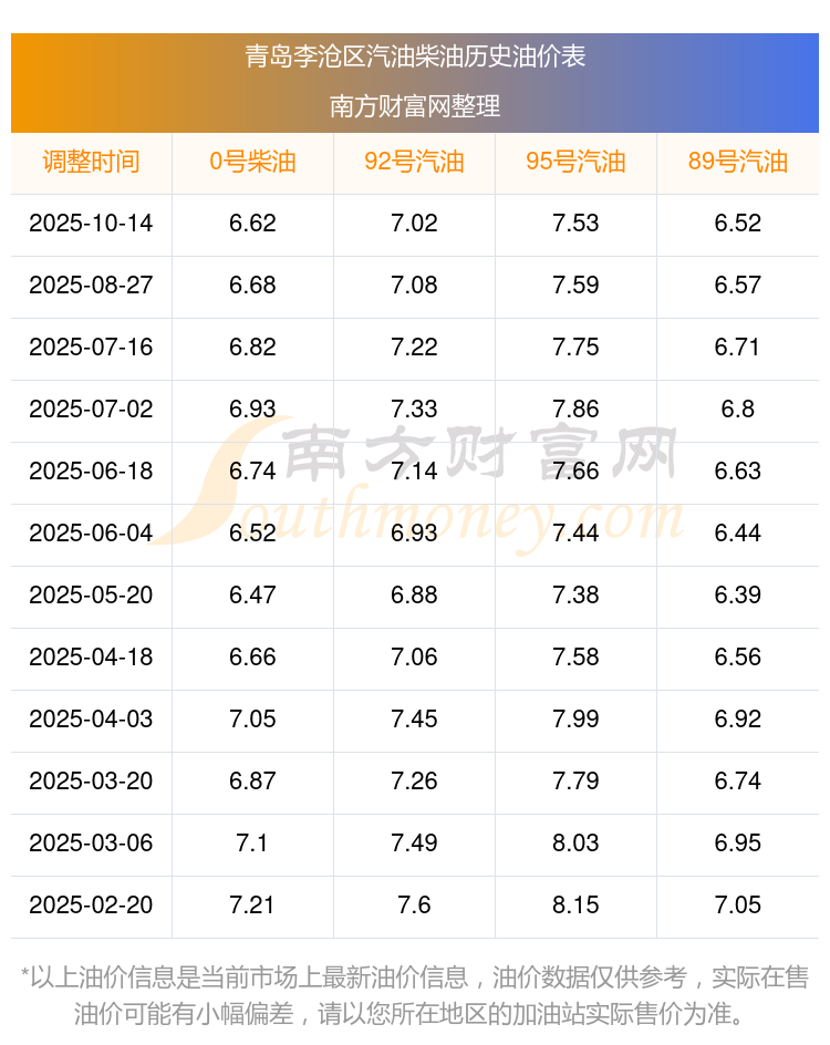 青岛李沧区汽油柴油10月22日的价格每升多少钱?具体为:92号汽油为7.02元,跌了0.06元;95号汽油为7.53元,跌了0.06元;89号汽油为6.52元,跌了0.05元;0号柴油为6.62元,跌了0.06元,本轮油价的调整时间为10月14日。