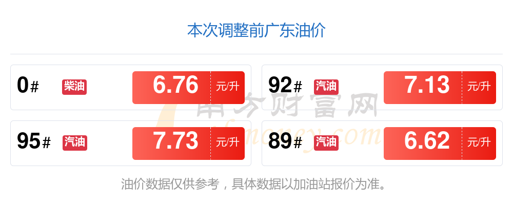 10月23日广东汽油、柴油每升的最新价格:92号汽油7.07元,减了0.06元;95号汽油7.66元,减了0.07元;89号汽油6.57元,减了0.05;0号柴油为6.7元,减了0.06元,本次油价调整时间是10月14日。