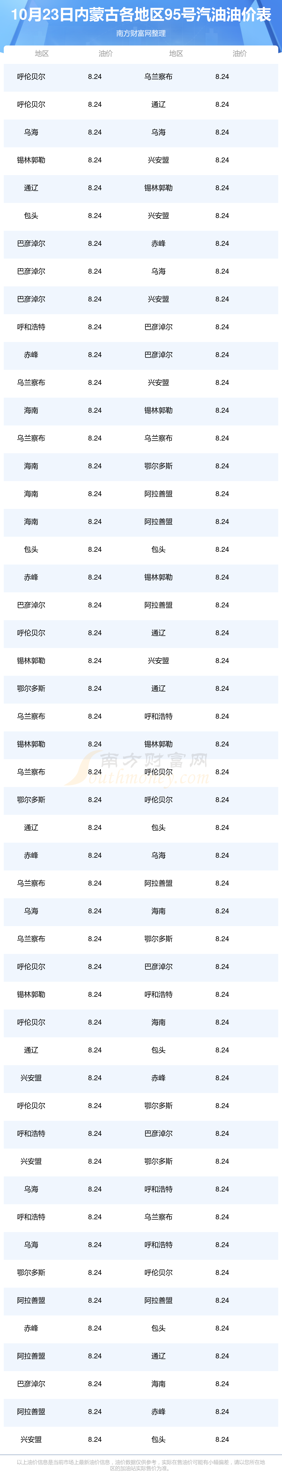 10月23日内蒙古95号汽油的价格为7.46元每升,这是10月14日调整后的时间,相对上一轮调整共下跌了0.07元。