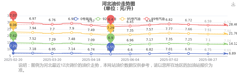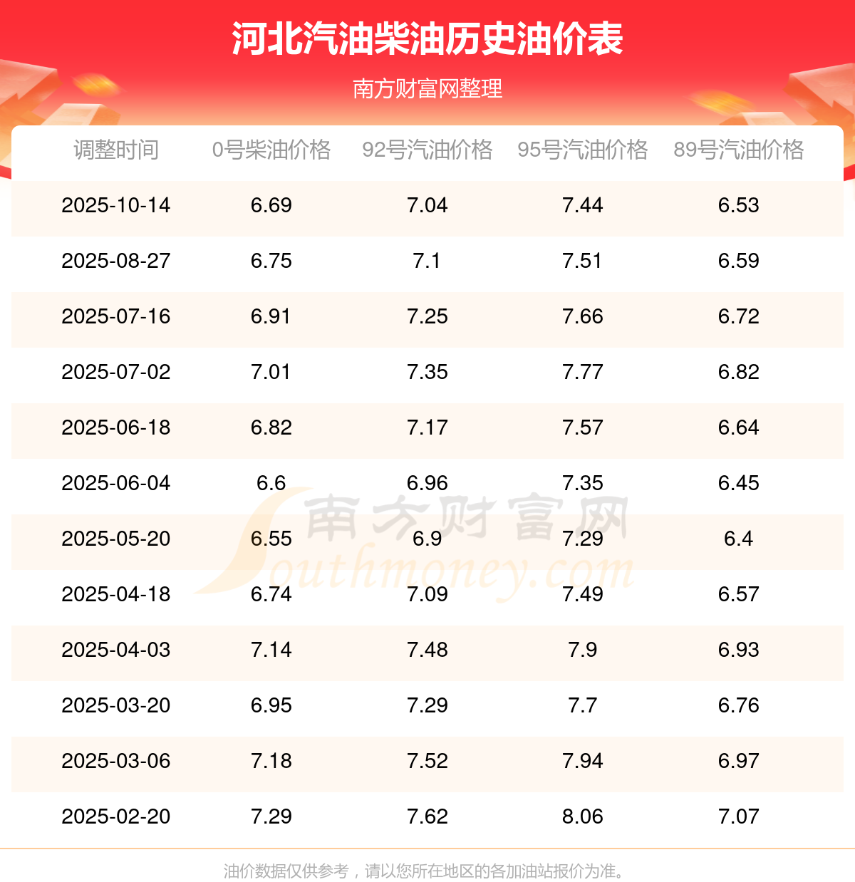 10月23日,河北汽油、柴油每升最新价格为:92号汽油为7.04元,下调了0.06元;95号汽油为7.44元,下调了0.07元;89号汽油为6.53元,下调了0.06;0号柴油为6.69元,下调了0.06元,调整时间为10月14日。