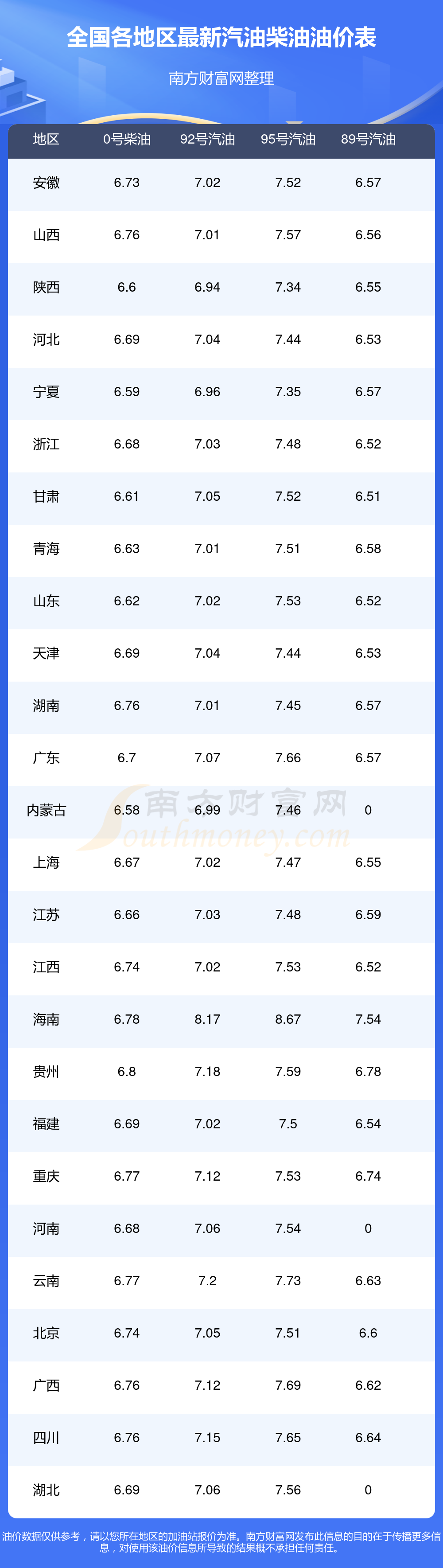 以上油价信息是当前市场上最新油价信息,油价数据仅供参考,实际在售油价可能有小幅偏差,请以您所在地区的加油站实际售价为准。