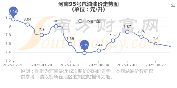 10月23日河南95号汽油的价格是10月14日调整后的价格,为7.54元/升,对比上一次油价调整共下降了0.06元。