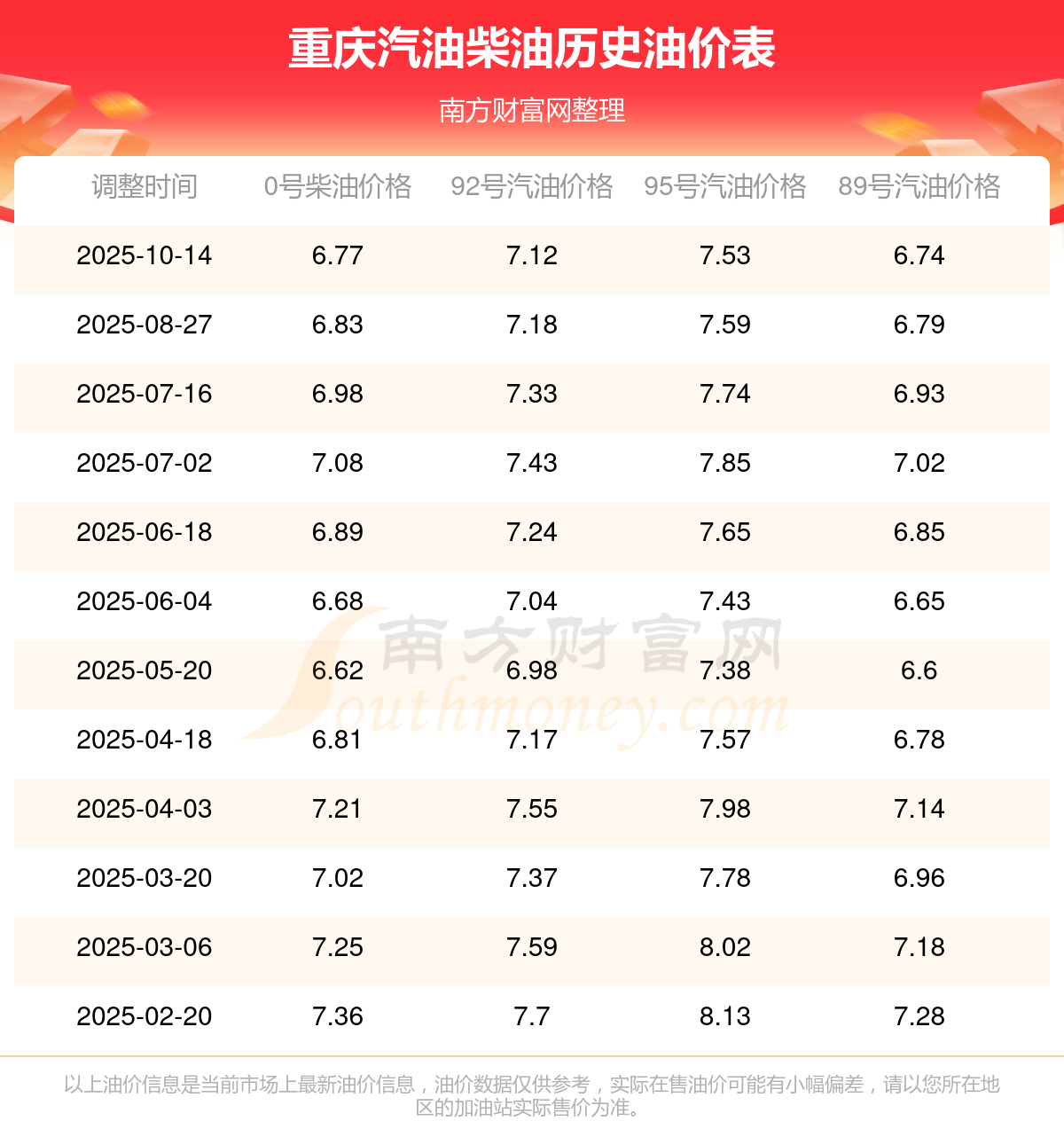 重庆汽油柴油历史油价表