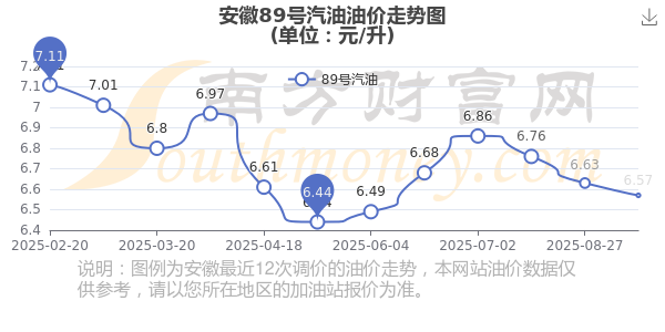 10月23日,安徽89号汽油的价格是6.57元每升,本次的调整时间为10月14日,对比上次的调整下跌了0.06元,下跌0.905%,10月27日24时为下一轮油价调整时间,还有4.91天。